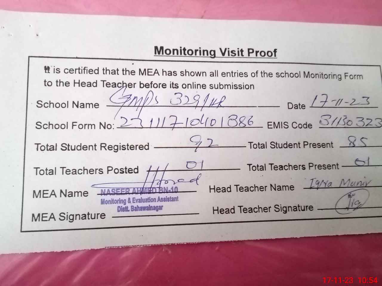 | Attendance Register | Head Teacher | MEA with School | Visit Proof |