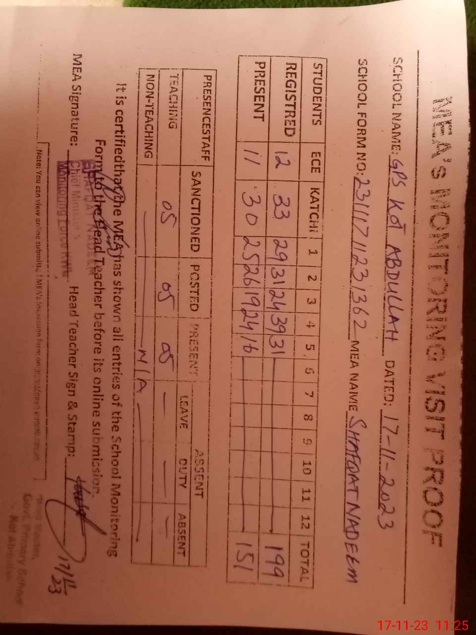 | EMIS Code: 36420217 | Name of School: GPS KOT ABDULLAH, P/O MAKHDOOM PUR, KHANEWAL | |||