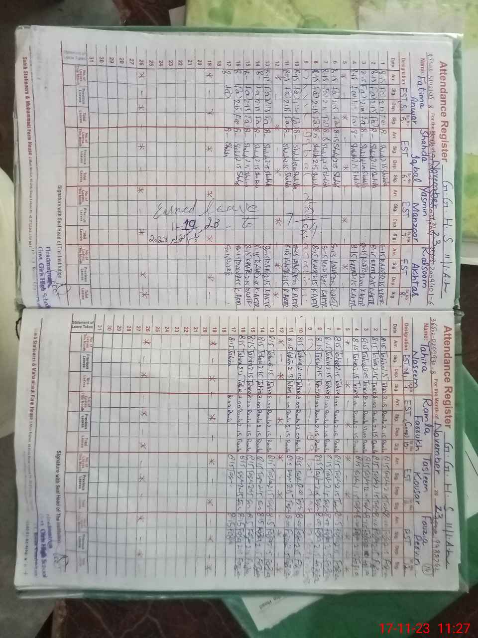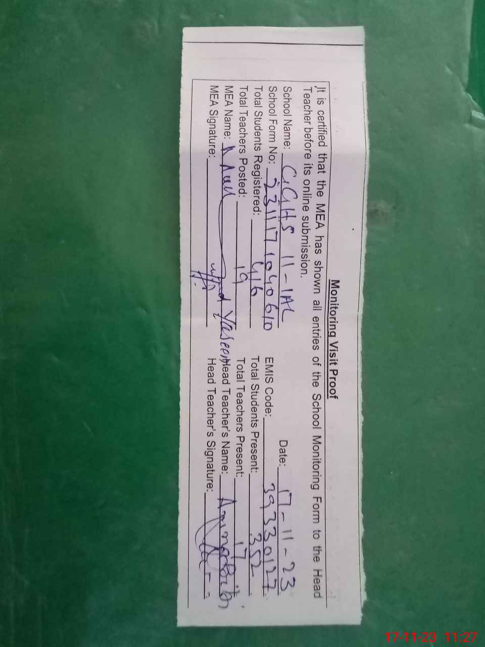 | Attendance Register | Head Teacher | MEA with School | Visit Proof |