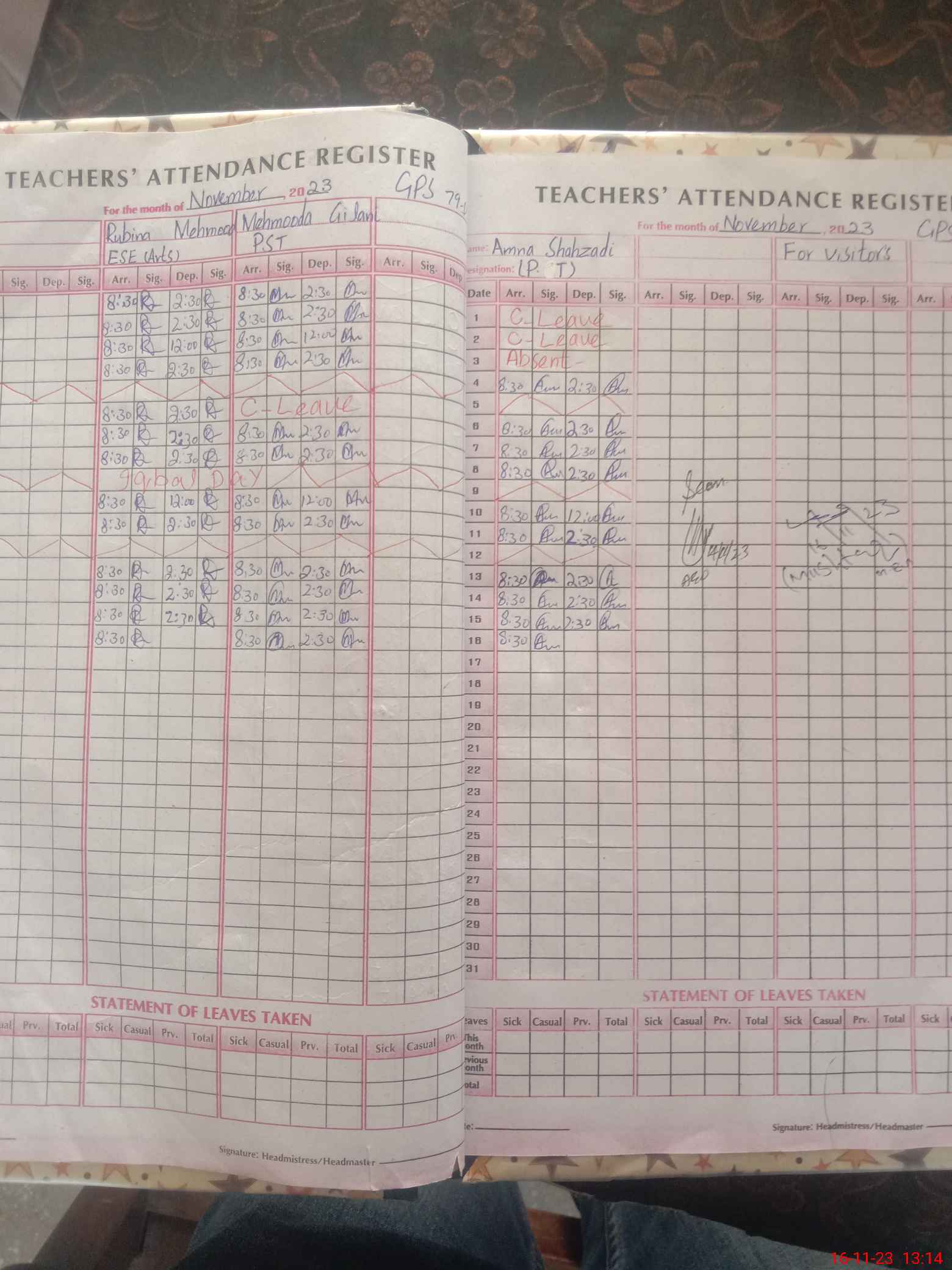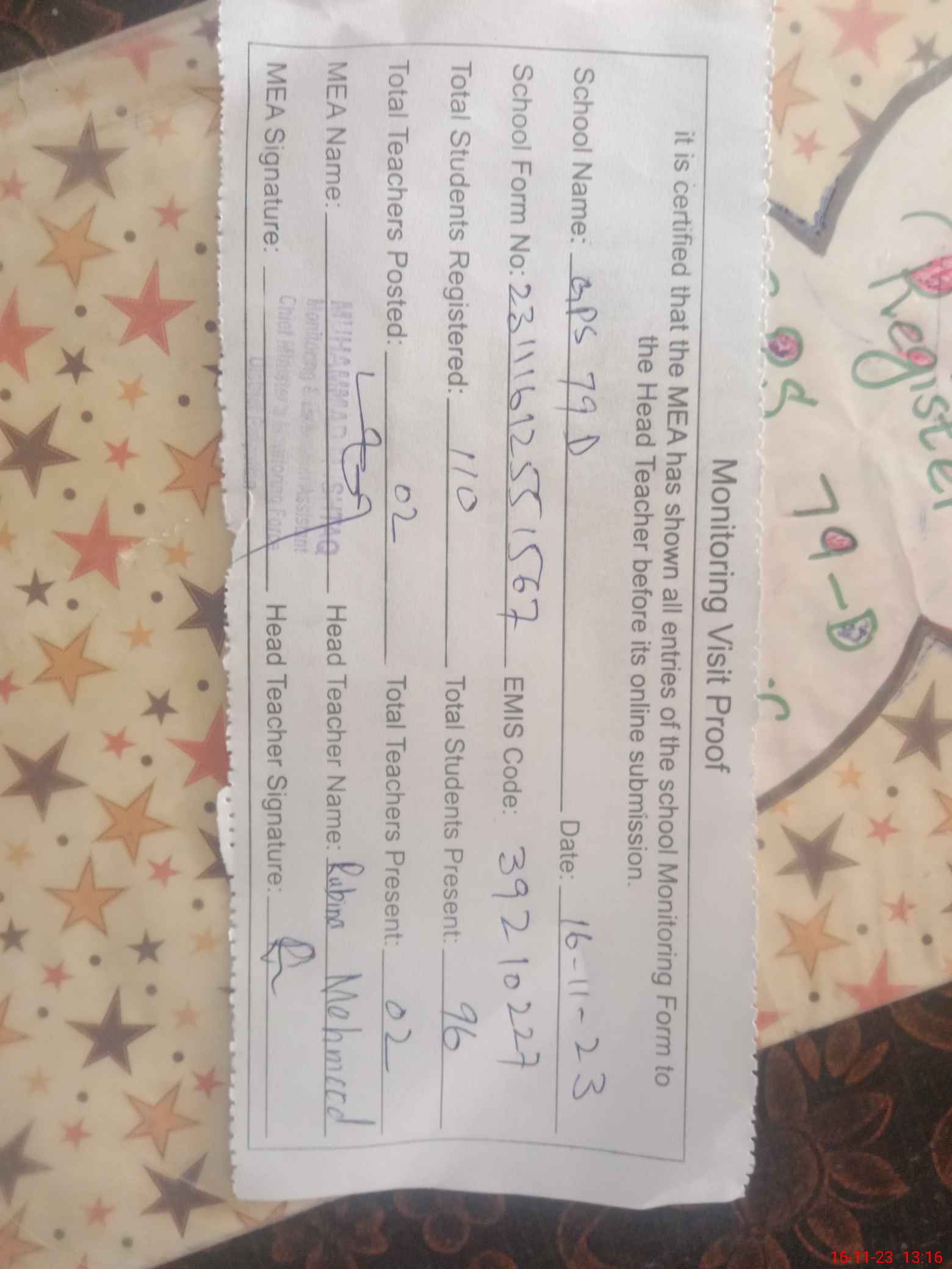 | Attendance Register | Head Teacher | MEA with School | Visit Proof |