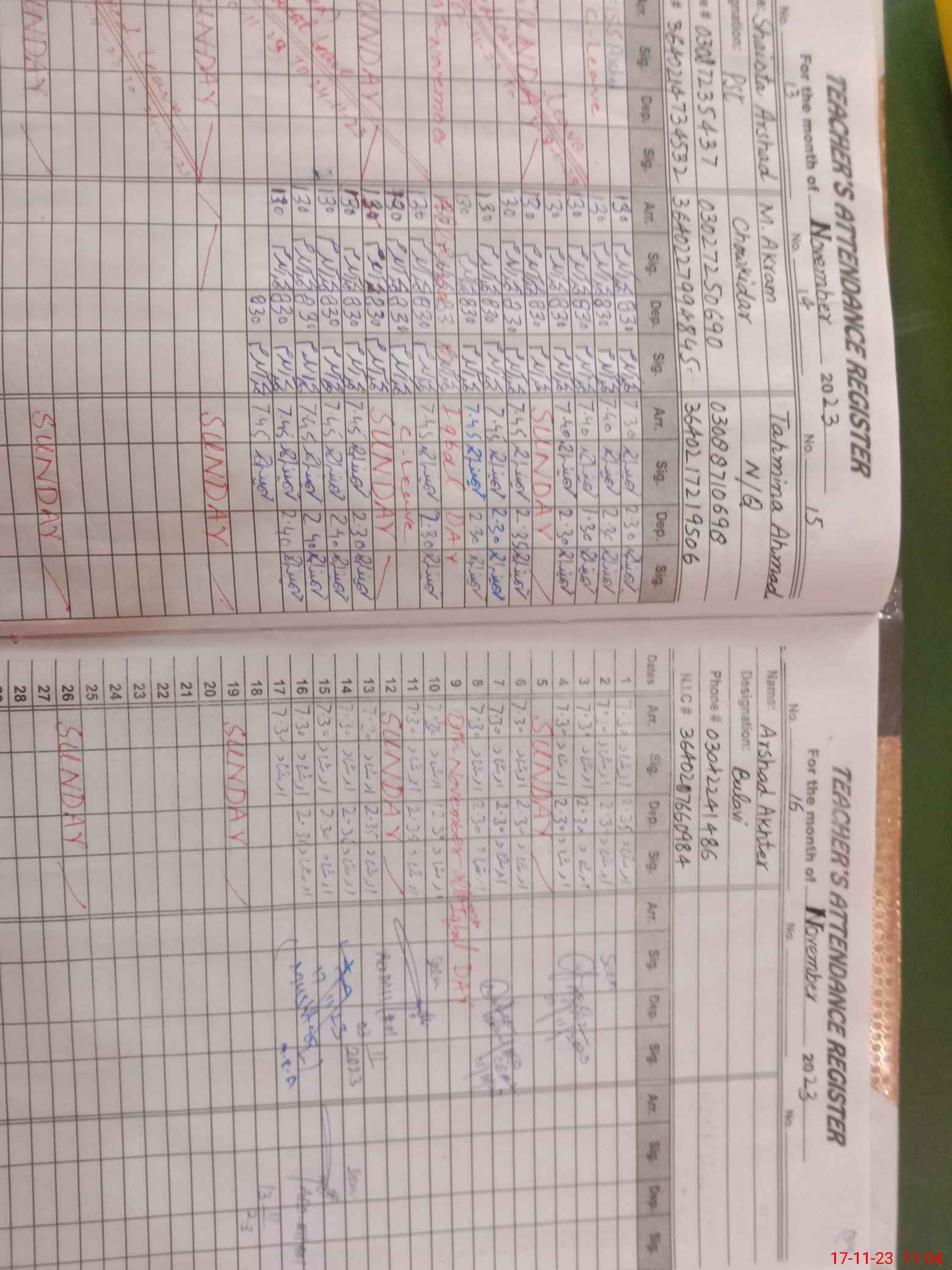 | CNIC | Full Name | Designation | R/C | Absence During Last Calender Month |