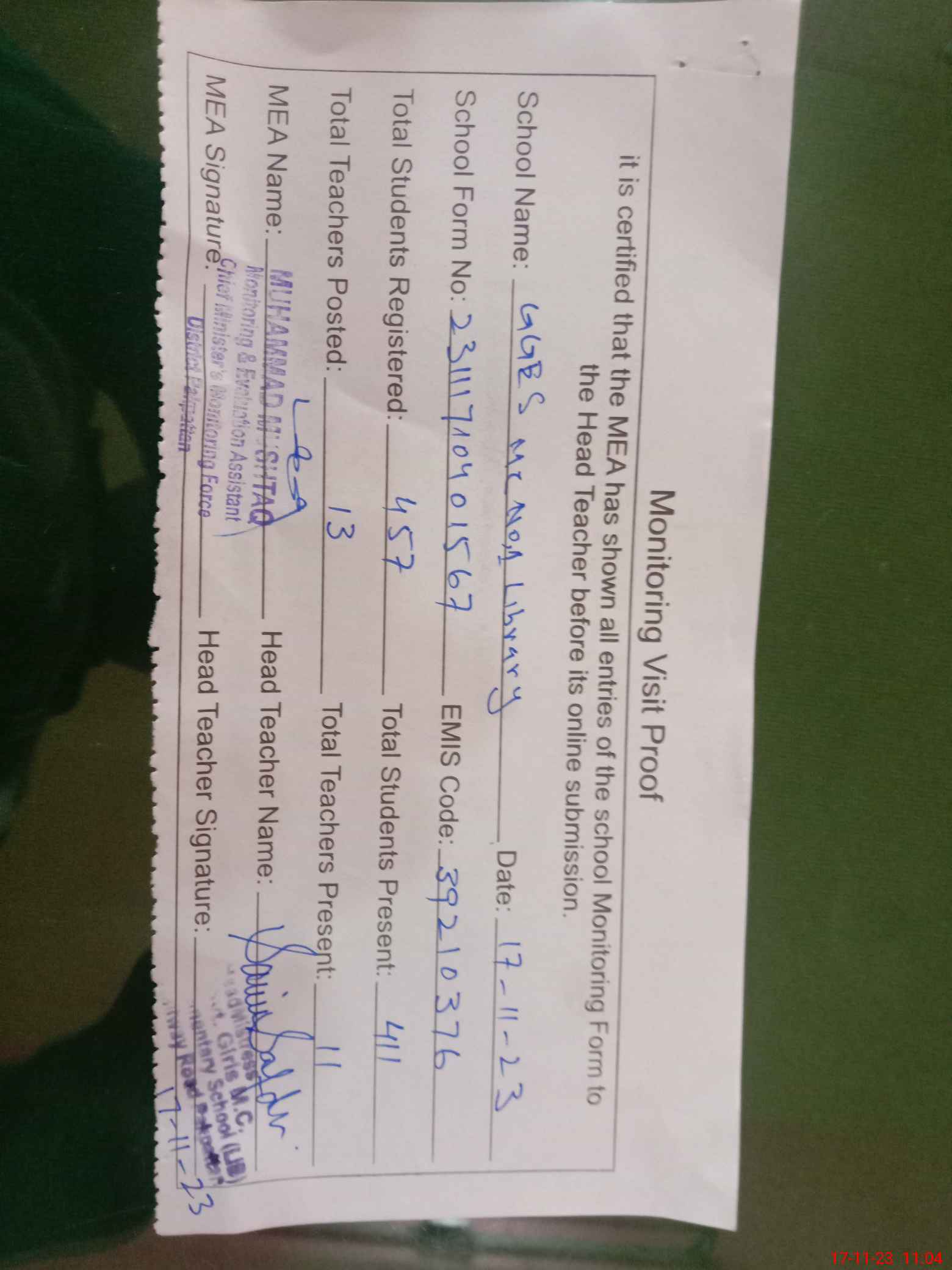 | Attendance Register | Head Teacher | MEA with School | Visit Proof |