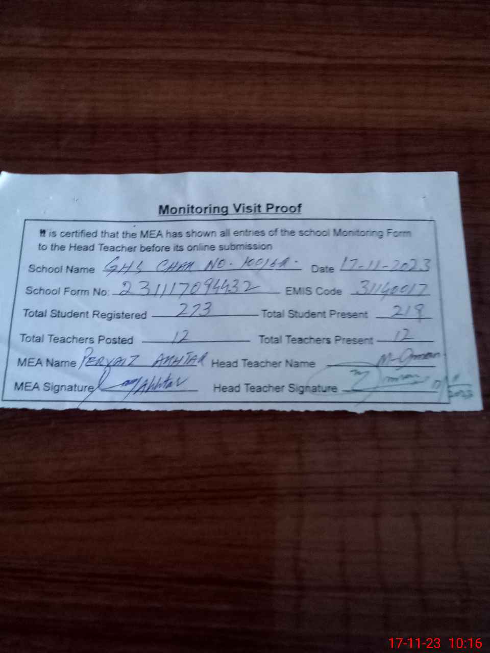 | Attendance Register | Head Teacher | MEA with School | Visit Proof |