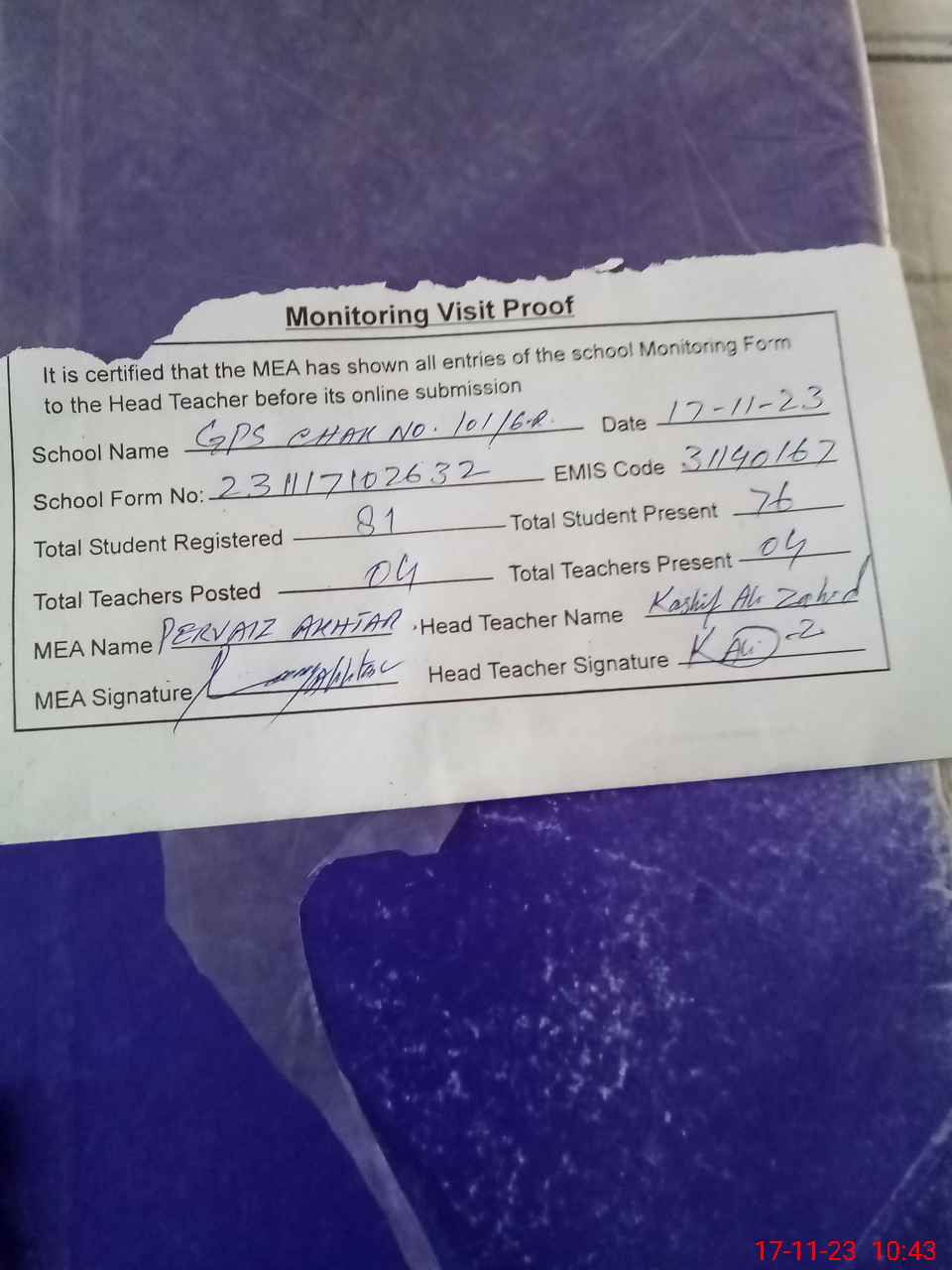 | EMIS Code: 31140167 | Name of School: GPS CHAK NO. 101/6-R | |||