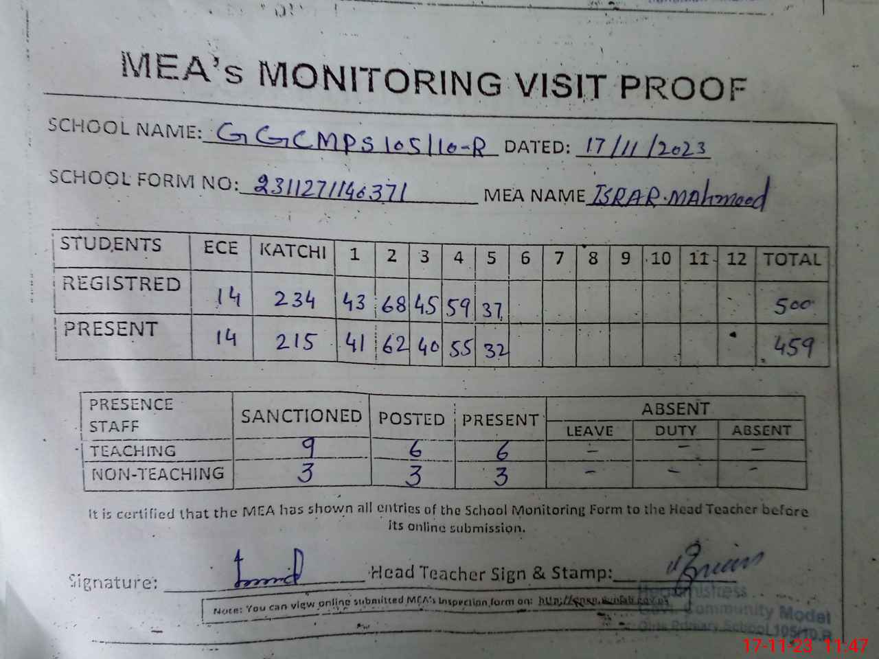 | Attendance Register | Head Teacher | MEA with School | Visit Proof |