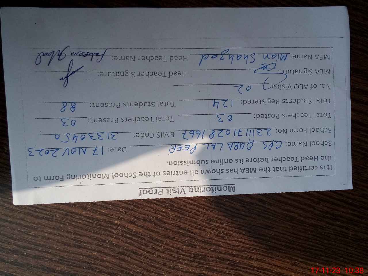 | Monitoring Date: 17-11-2023 | Start Time: 17-11-2023 10:07 AM | End Time: 17-11-2023 10:38 AM | Name of MEA: Sh**** Ah**** | |