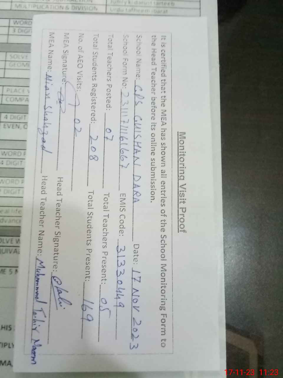 | Attendance Register | Head Teacher | MEA with School | Visit Proof |