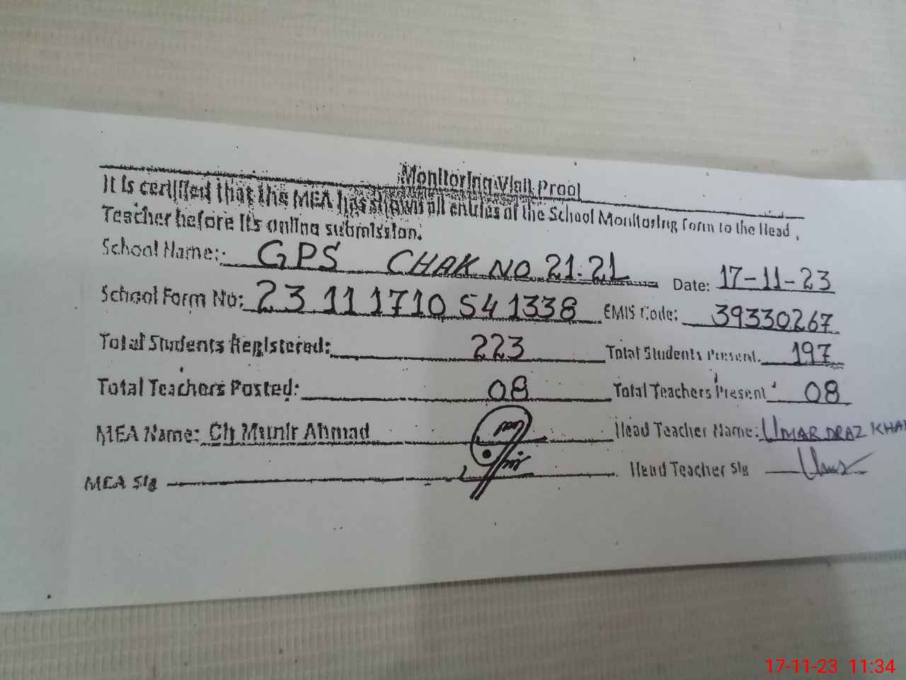 | EMIS Code: 39330267 | Name of School: GPS CHAK 21 2L | |||