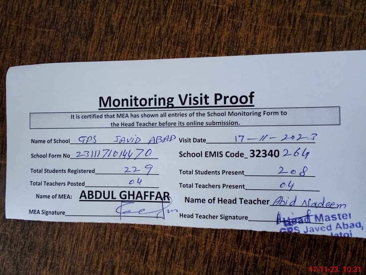 | Attendance Register | Head Teacher | MEA with School | Visit Proof |