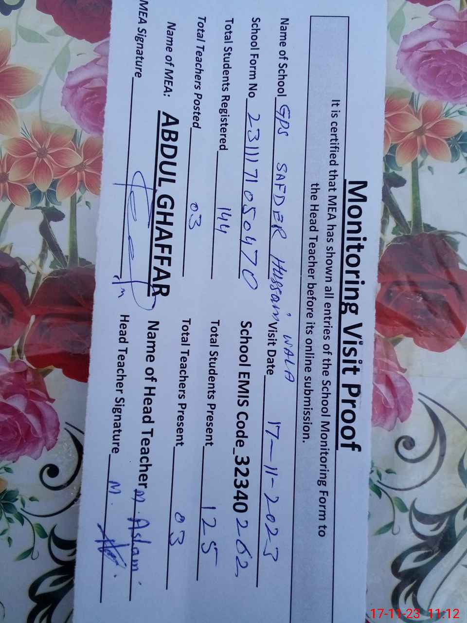 | Attendance Register | Head Teacher | MEA with School | Visit Proof |