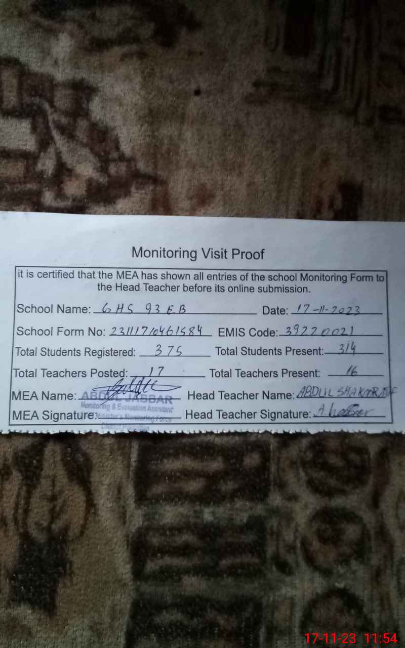 | EMIS Code: 39220021 | Name of School: GHS 93/E-B TEH ARIF WALA | |||