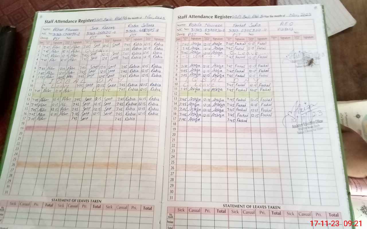 | CNIC | Full Name | Designation | R/C | Absence During Last Calender Month |