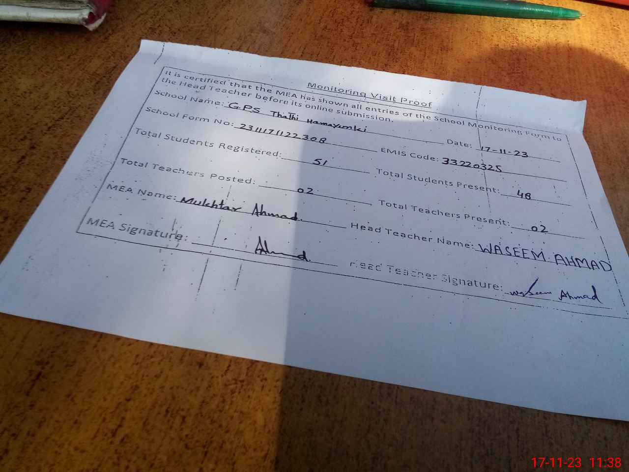 | EMIS Code: 33220325 | Name of School: GPS THATHI HAMAYUN KI | |||