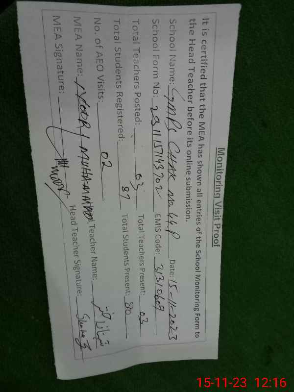 | EMIS Code: 31310609 | Name of School: GMPS CHAK 44/P (After Noon) | |||