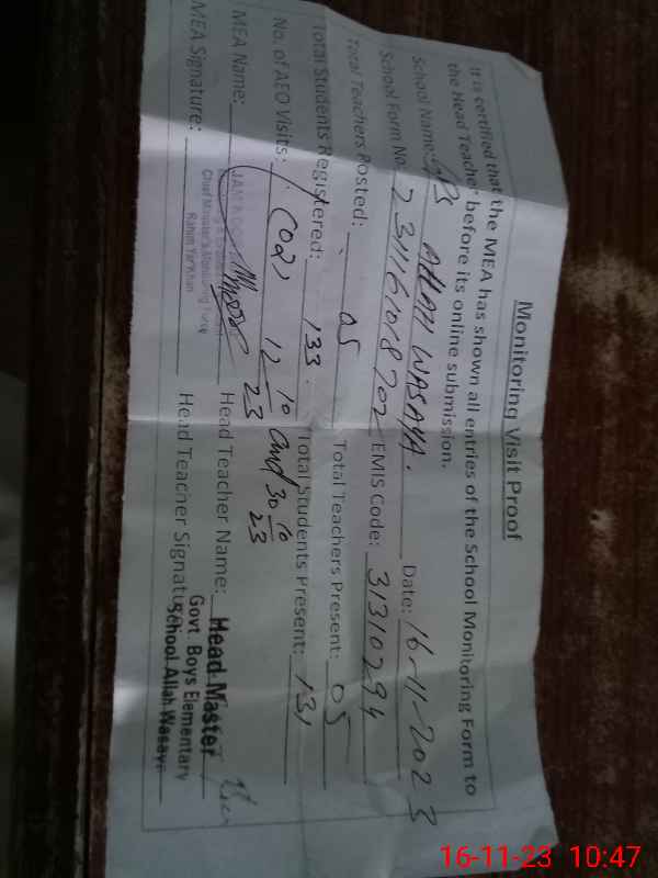 | EMIS Code: 31310294 | Name of School: GPS ALLAH WASAYA (After Noon) | |||