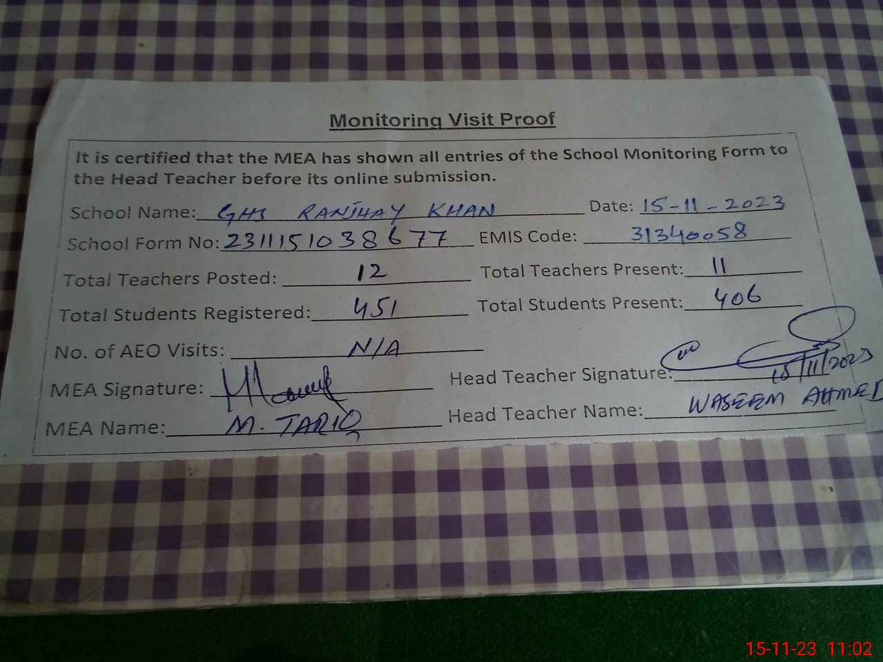 | Monitoring Date: 15-11-2023 | Start Time: 15-11-2023 10:19 AM | End Time: 15-11-2023 11:03 AM | Name of MEA: Mu**** Ta**** | |