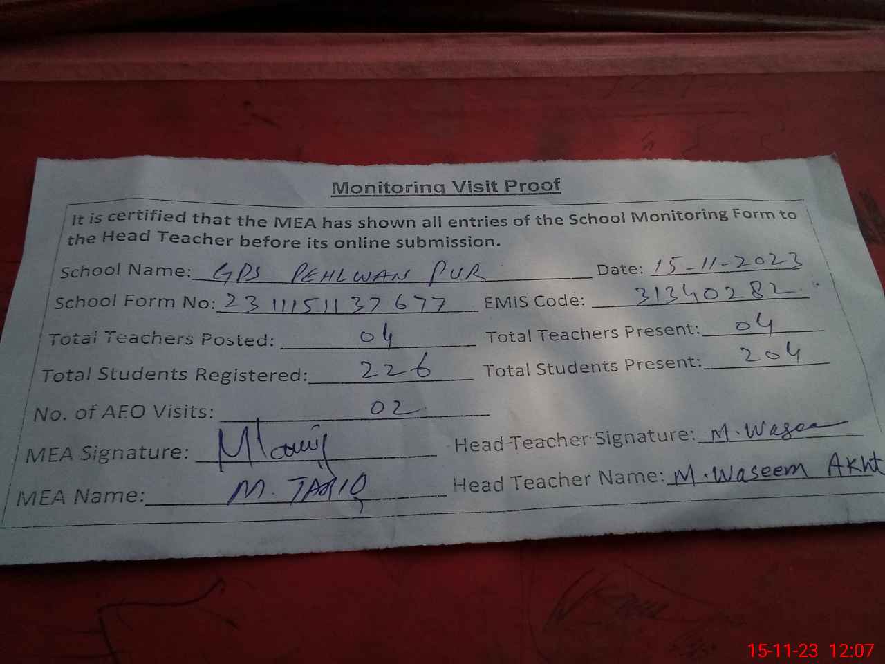 | EMIS Code: 31340282 | Name of School: GPS PEHLWAN PUR | |||