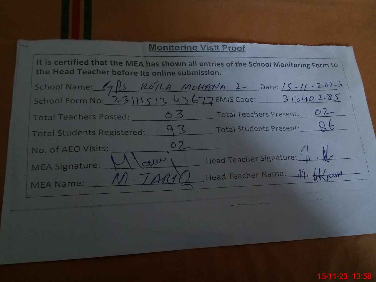 | Attendance Register | Head Teacher | MEA with School | Visit Proof |