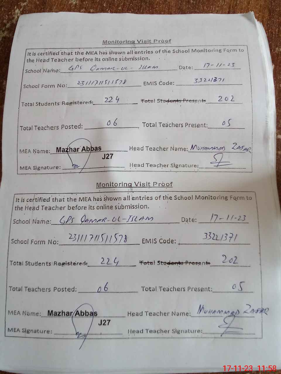 | EMIS Code: 33221371 | Name of School: GPS QAMAR-UL-ISLAM | |||