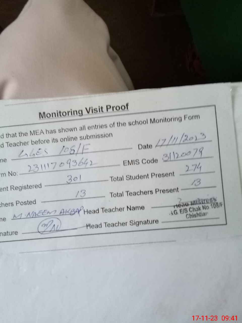 | Attendance Register | Head Teacher | MEA with School | Visit Proof |