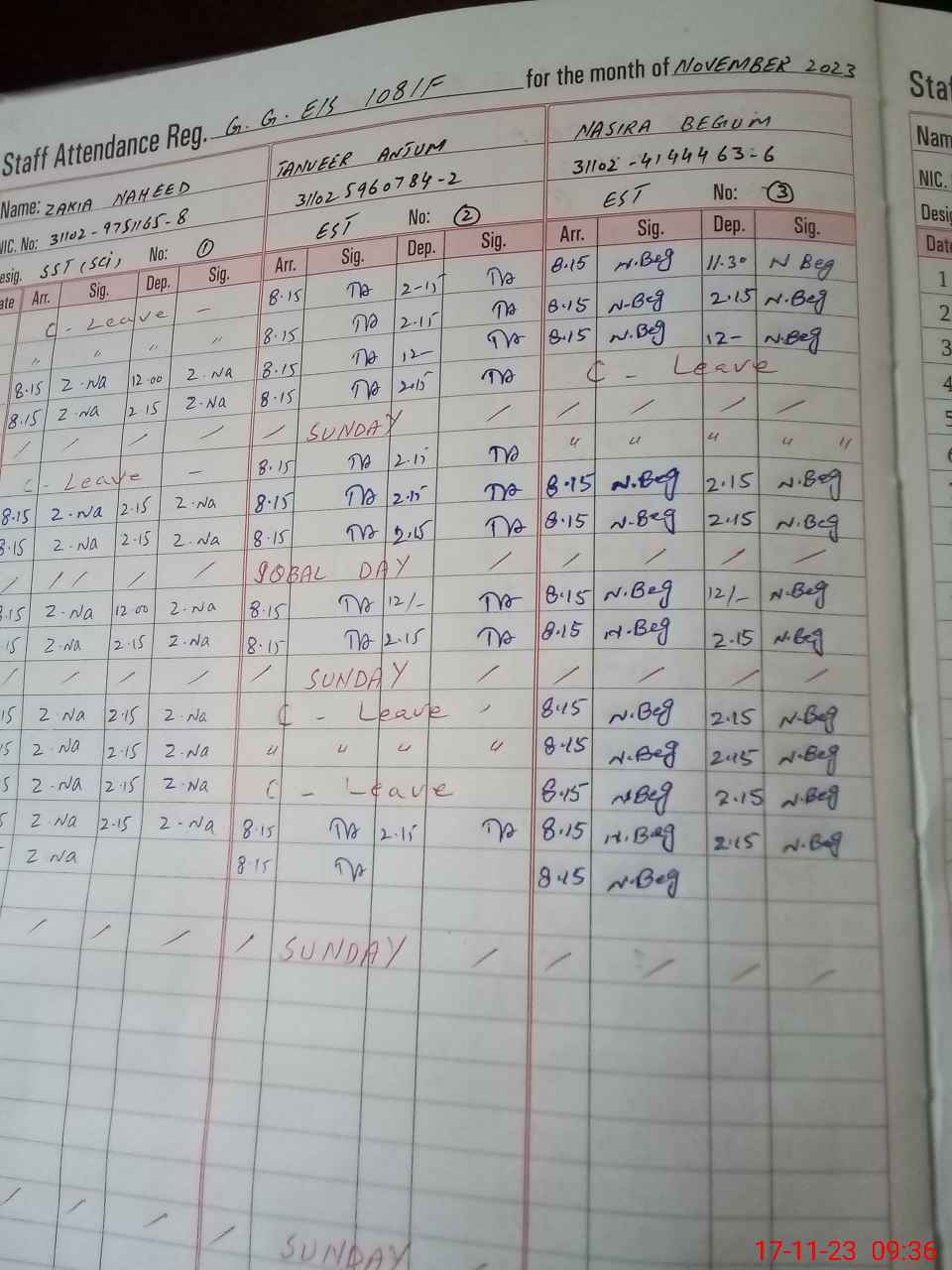 | CNIC | Full Name | Designation | R/C | Absence during last cal. month |