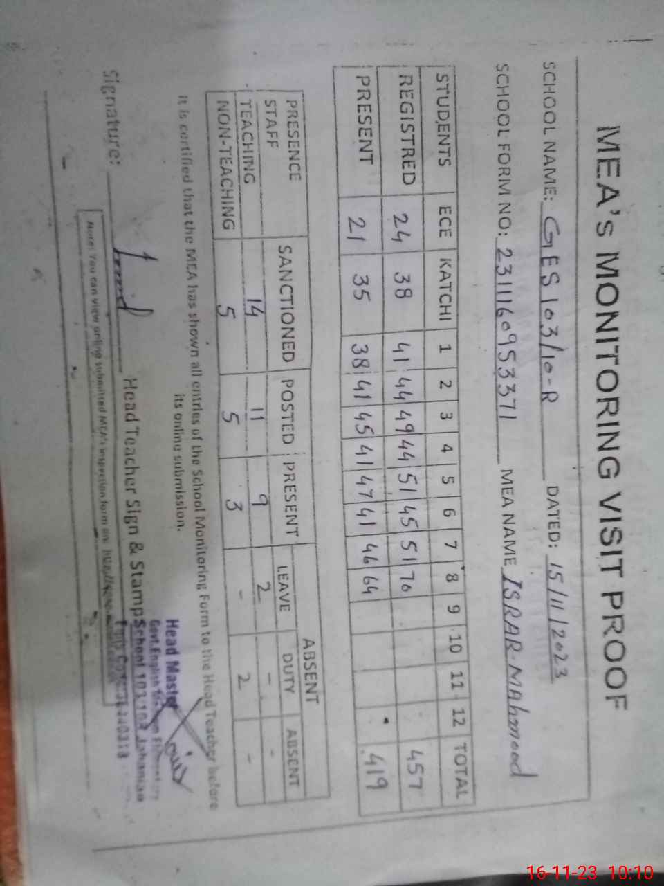 | Attendance Register | Head Teacher | MEA with School | Visit Proof |