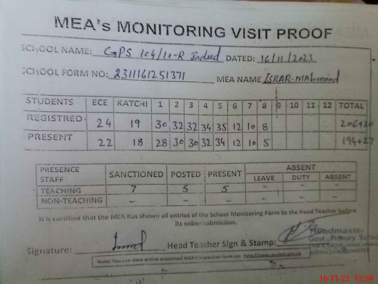 | Attendance Register | Head Teacher | MEA with School | Visit Proof |