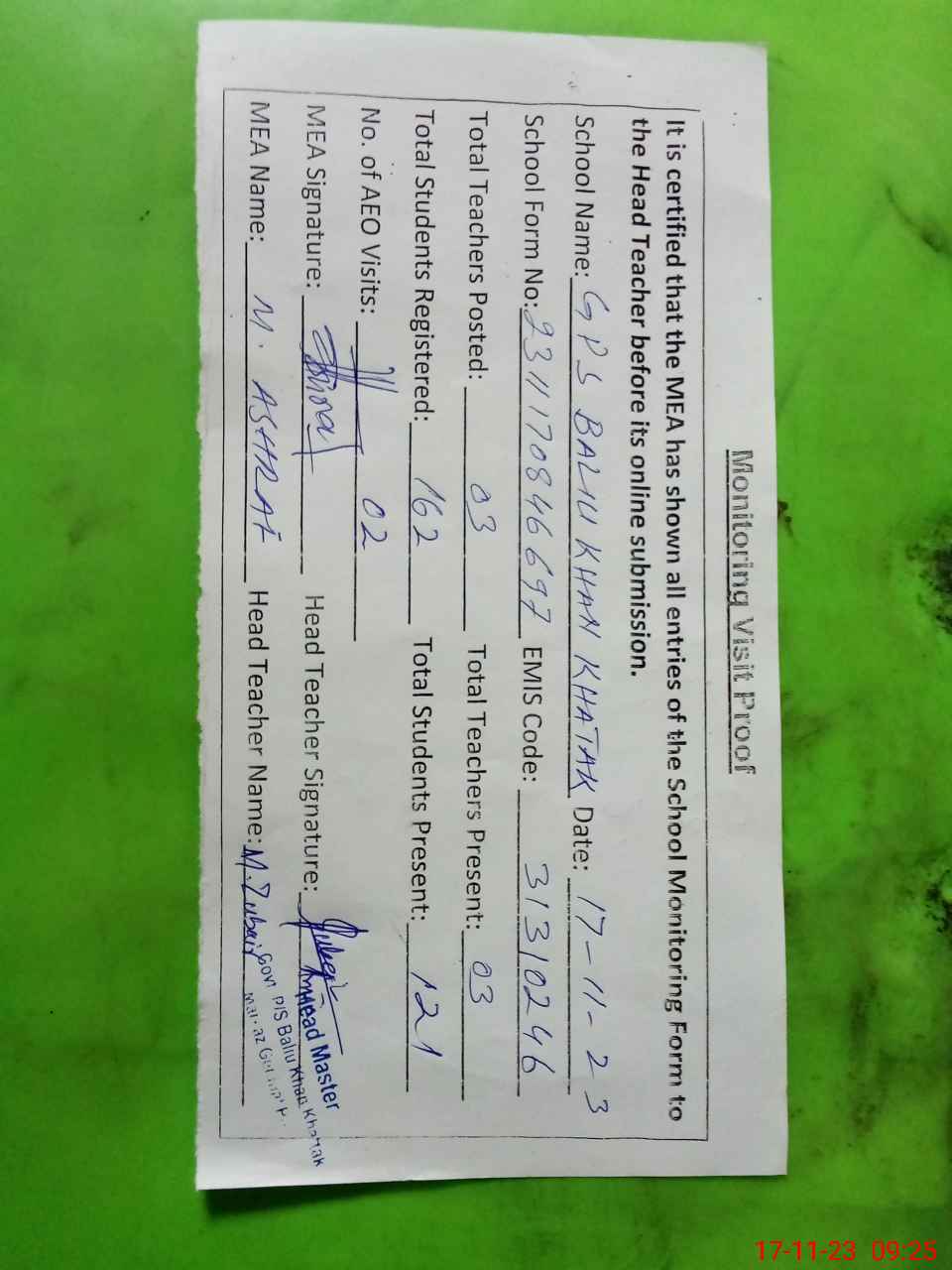| Attendance Register | Head Teacher | MEA with School | Visit Proof |