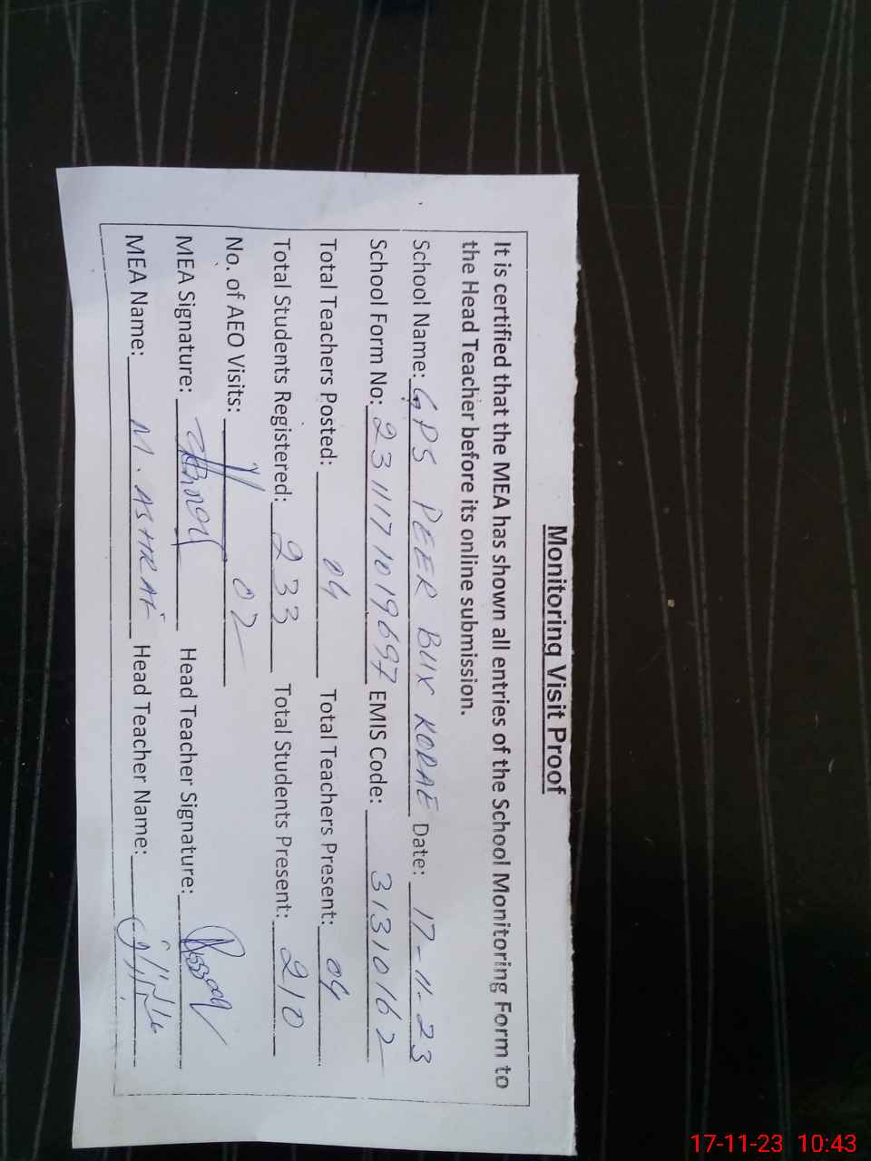 | EMIS Code: 31310162 | Name of School: GPS PEER BUX KORAI (After Noon) | |||