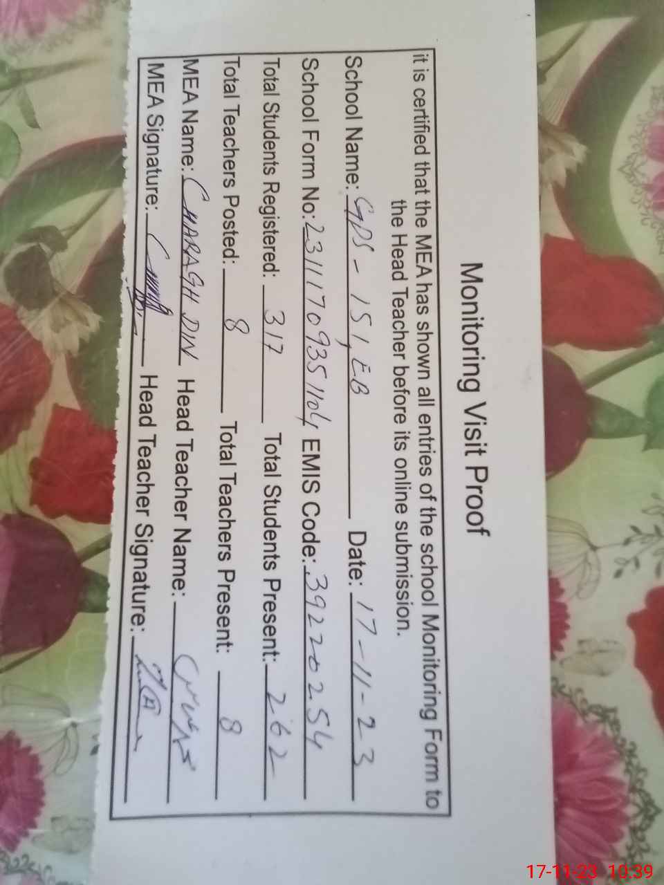 | Attendance Register | Head Teacher | MEA with School | Visit Proof |