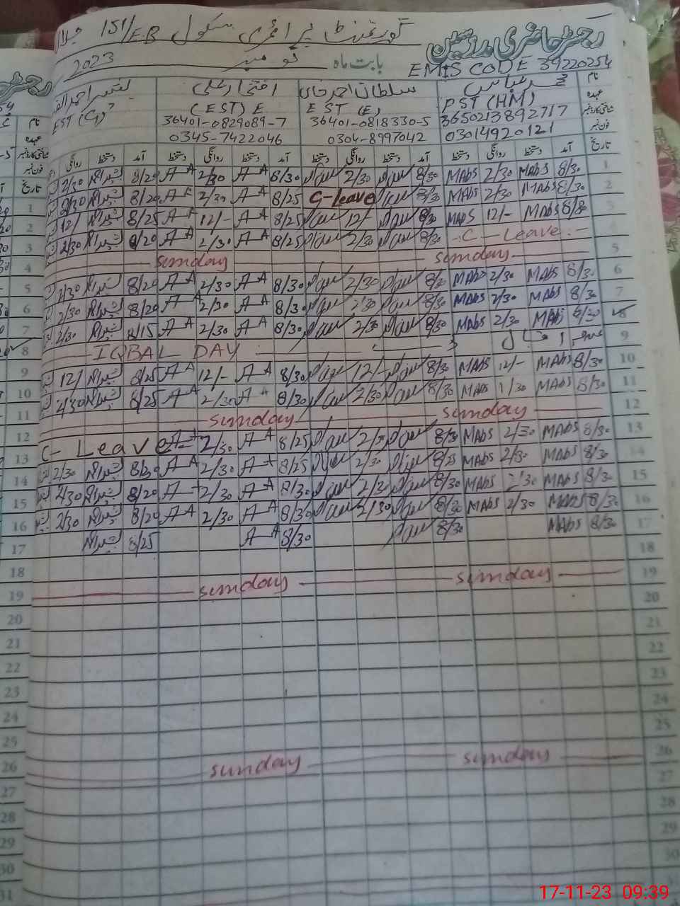 | CNIC | Full Name | Designation | R/C | Absence during last cal. month |