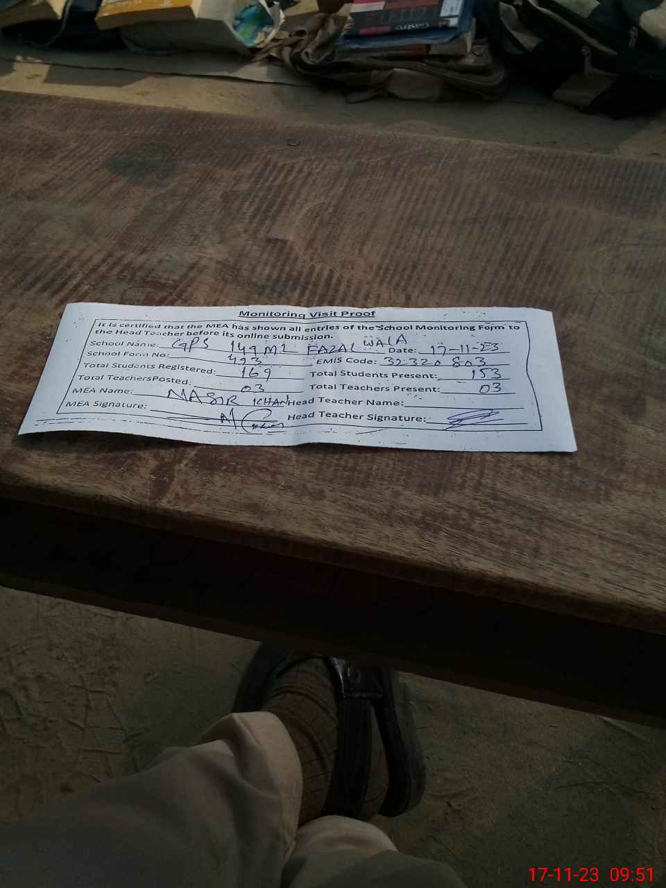 | Attendance Register | Head Teacher | MEA with School | Visit Proof |