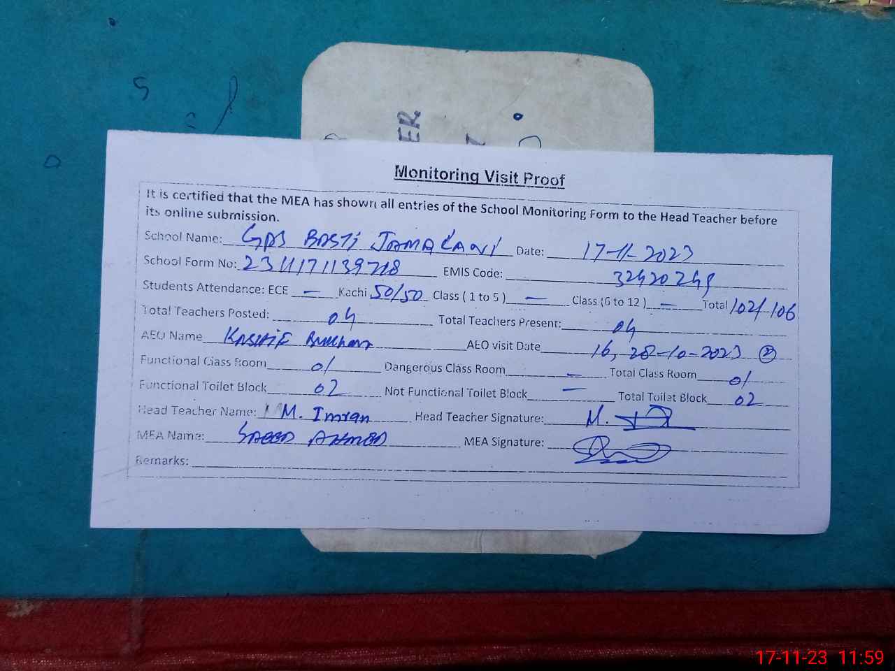 | Attendance Register | Head Teacher | MEA with School | Visit Proof |
