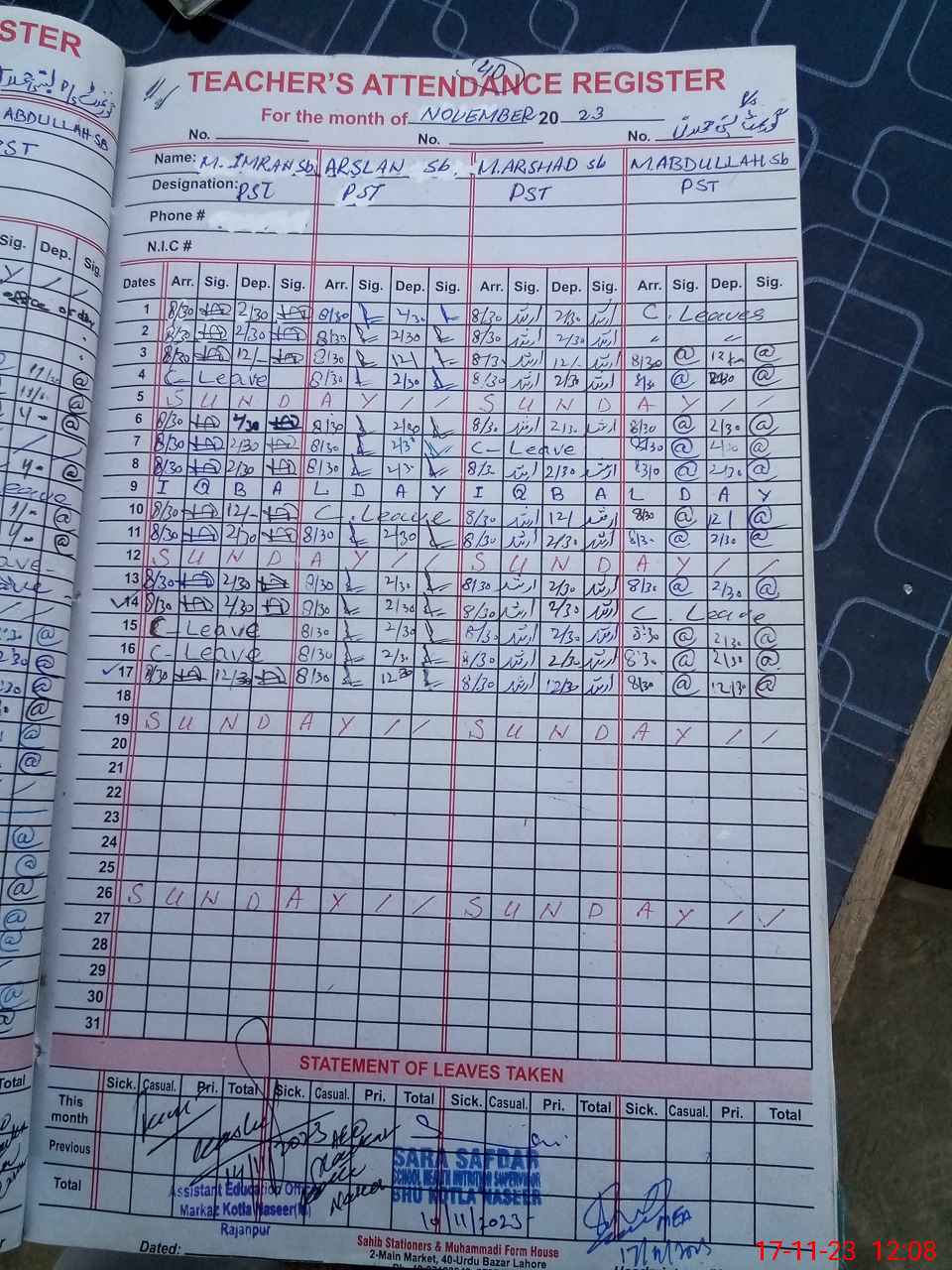 | CNIC | Full Name | Designation | R/C | Absence During Last Calender Month |