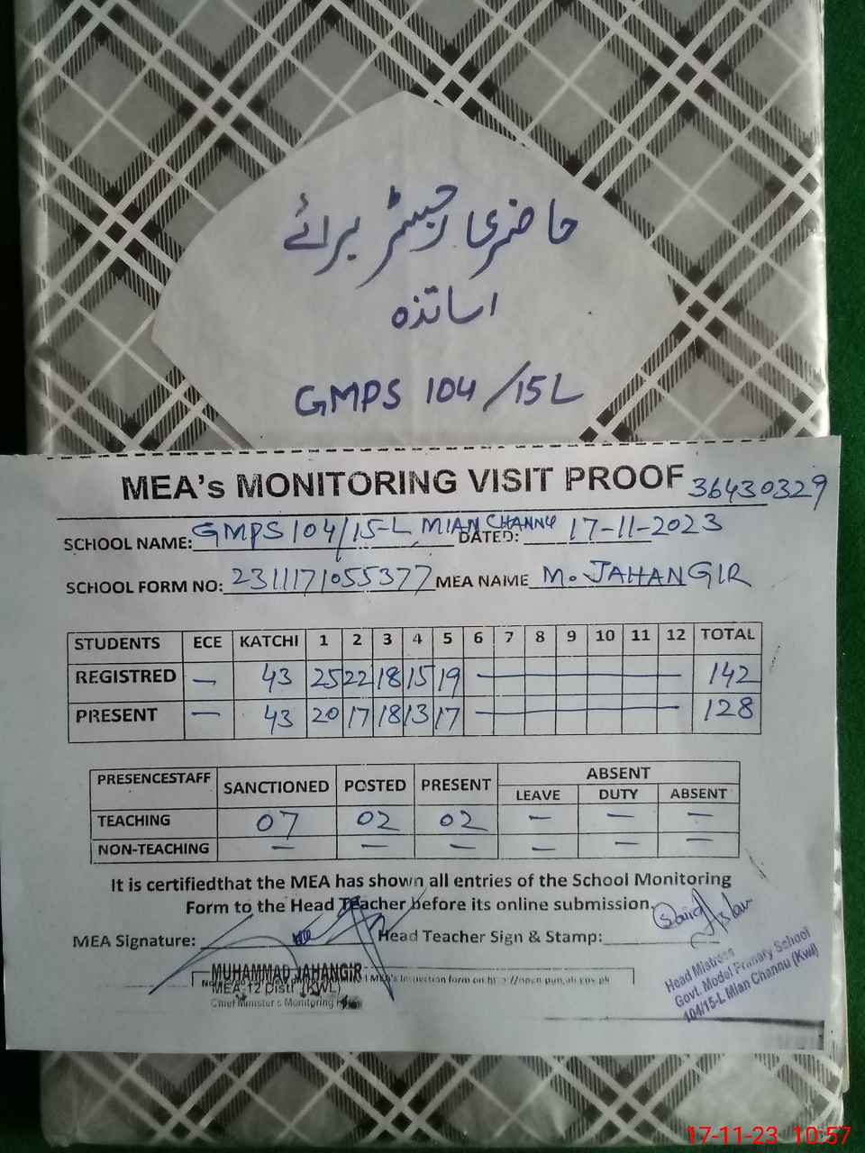 | EMIS Code: 36430329 | Name of School: GMPS 104/15-L, MIAN CHANNU | |||