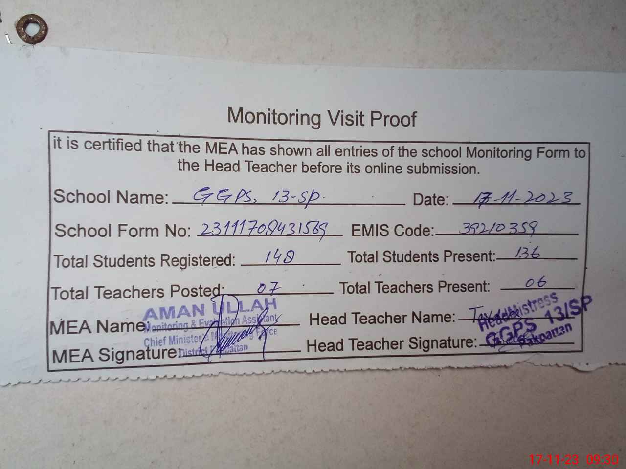 | Attendance Register | Head Teacher | MEA with School | Visit Proof |