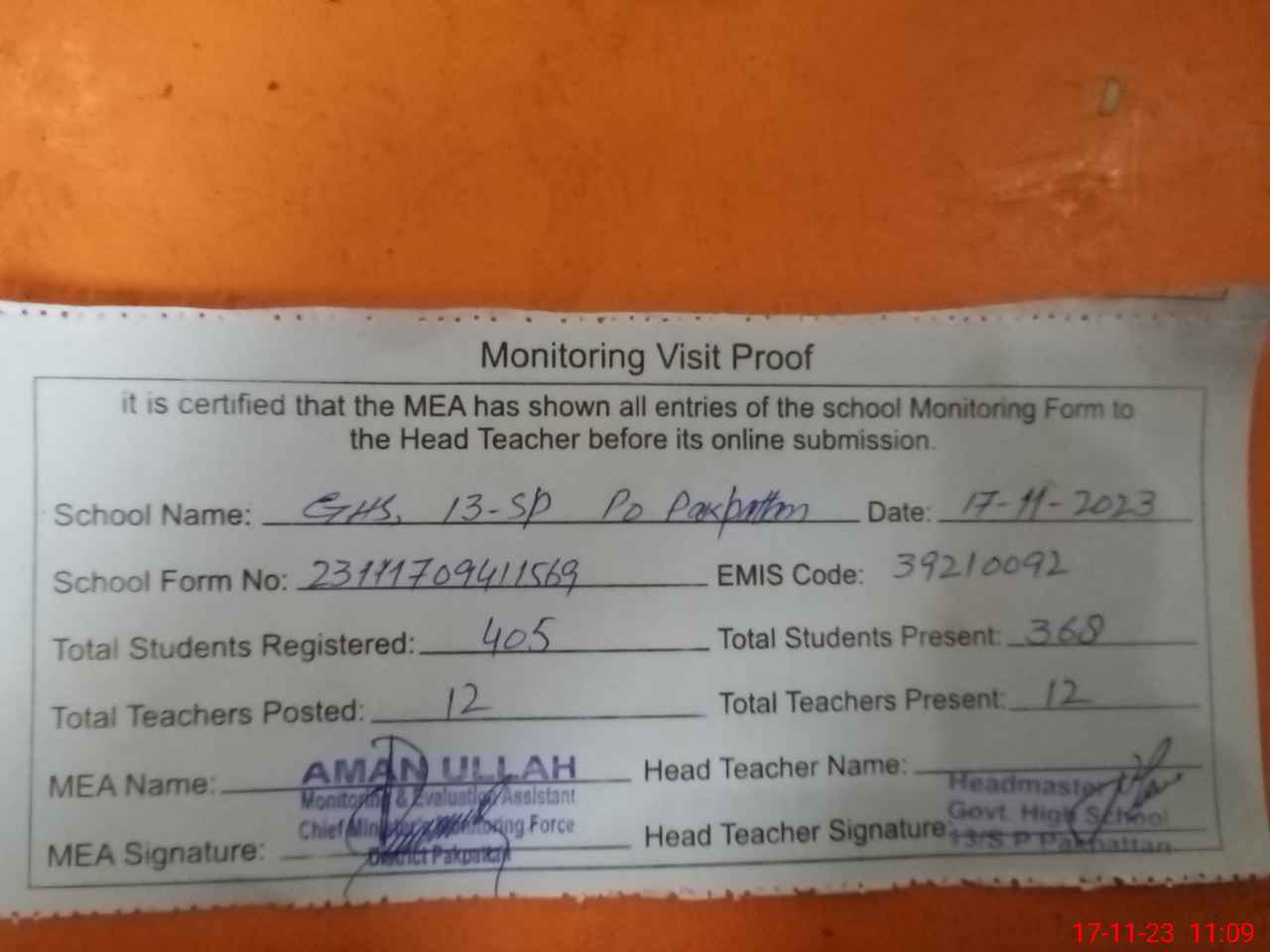| EMIS Code: 39210092 | Name of School: GHS 13/SP P.O PAKPATTAN | |||