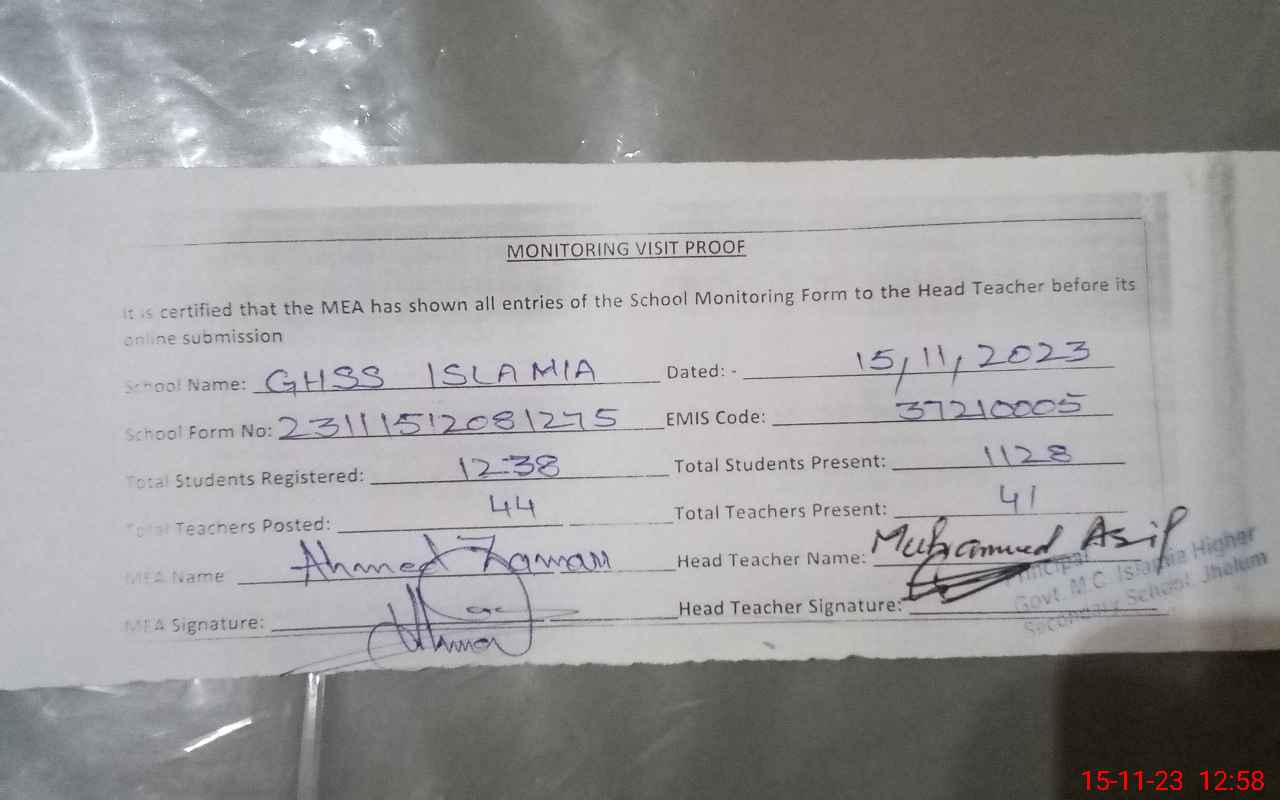 | EMIS Code: 37210005 | Name of School: GHSS MC ISLAMIA JHELUM | |||