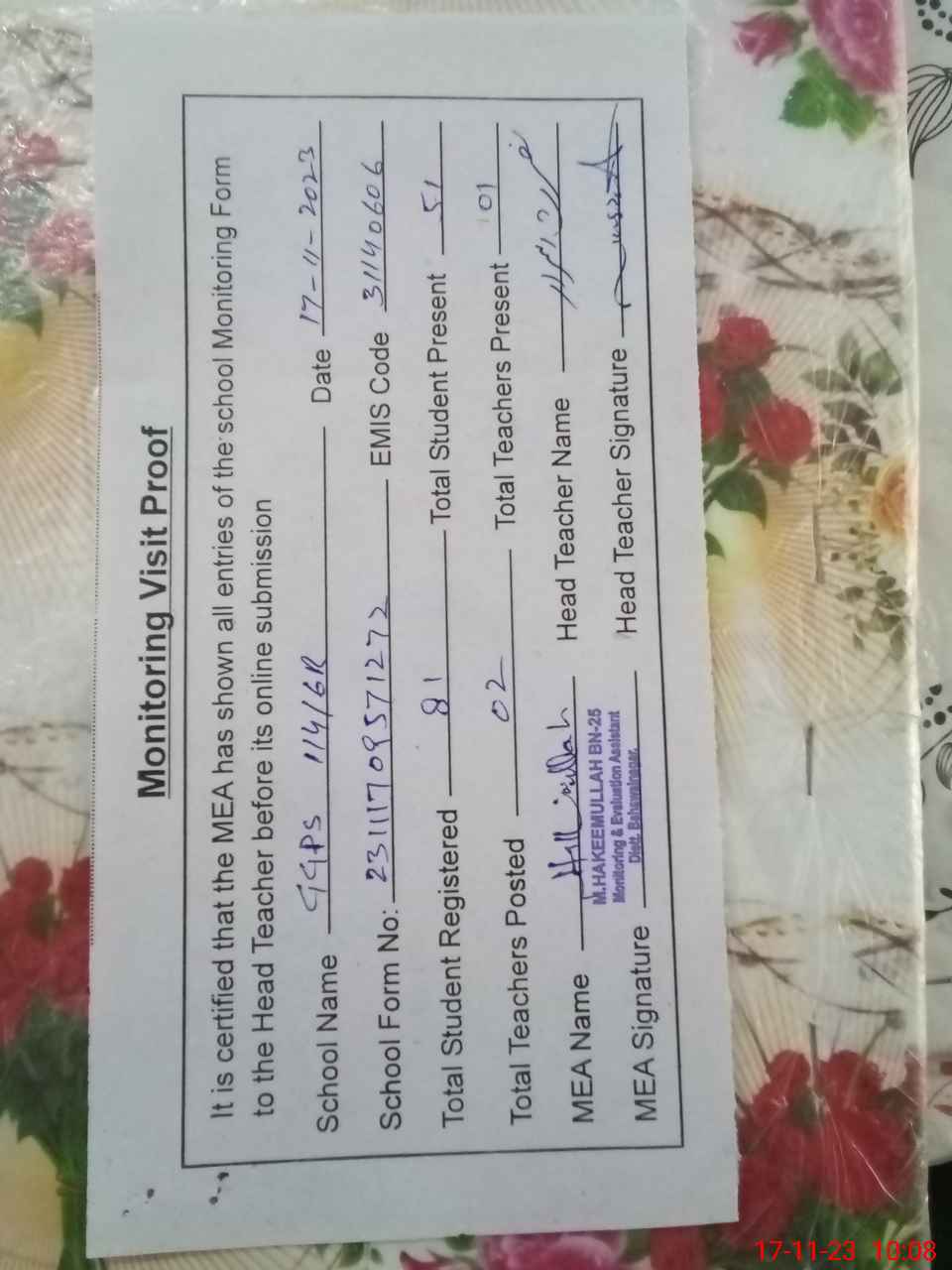 | EMIS Code: 31140606 | Name of School: GGPS CHAK NO. 114/6-R | |||