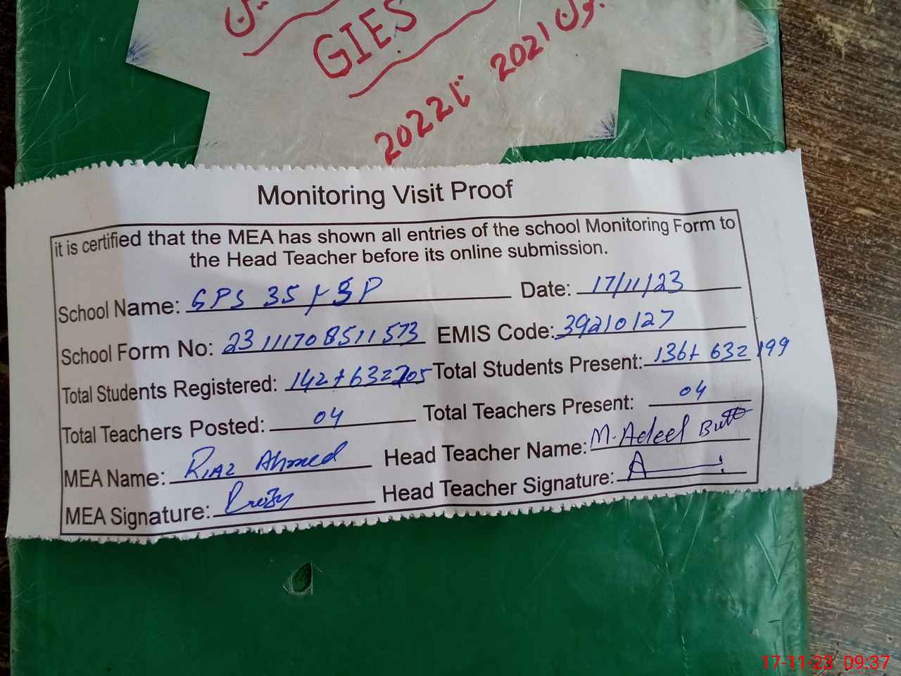 | Attendance Register | Head Teacher | MEA with School | Visit Proof |