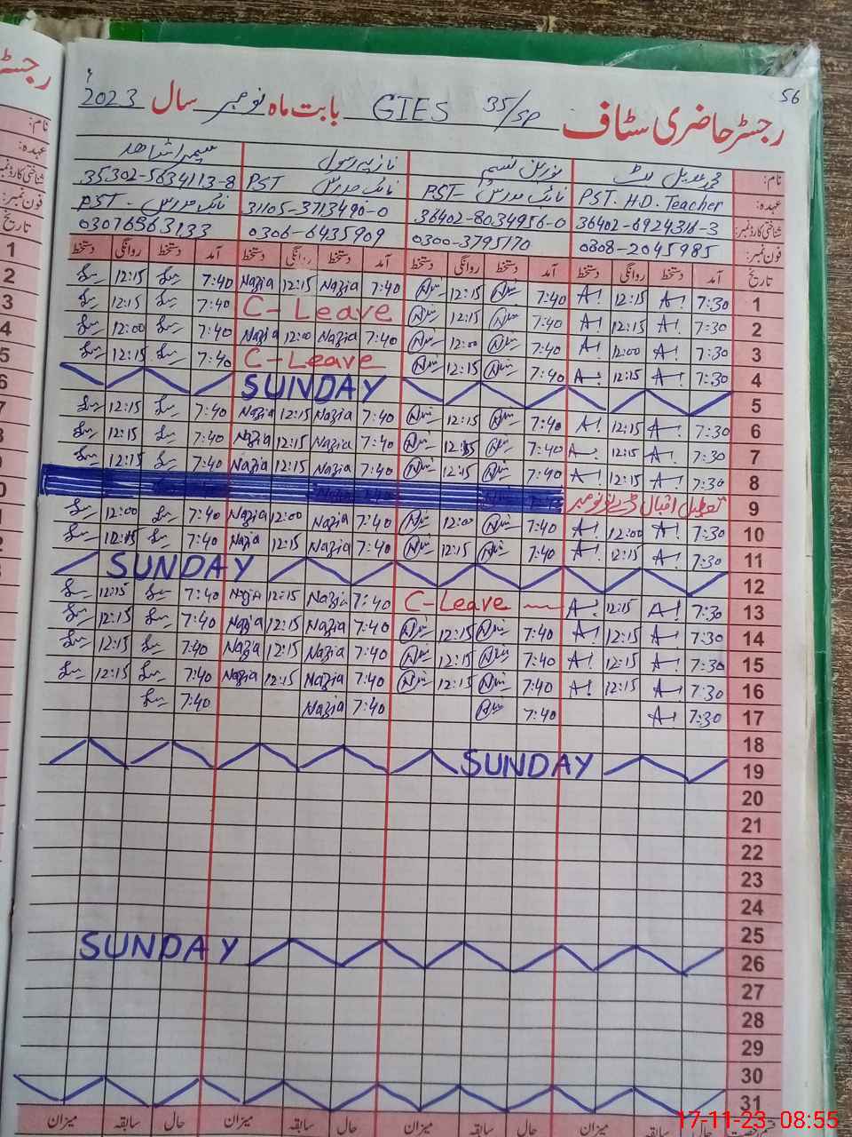 | CNIC | Full Name | Designation | R/C | Absence During Last Calender Month |