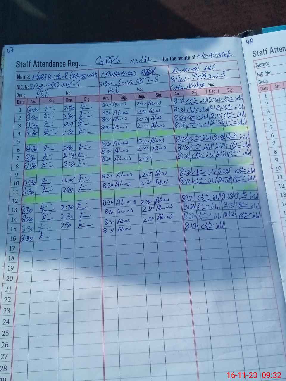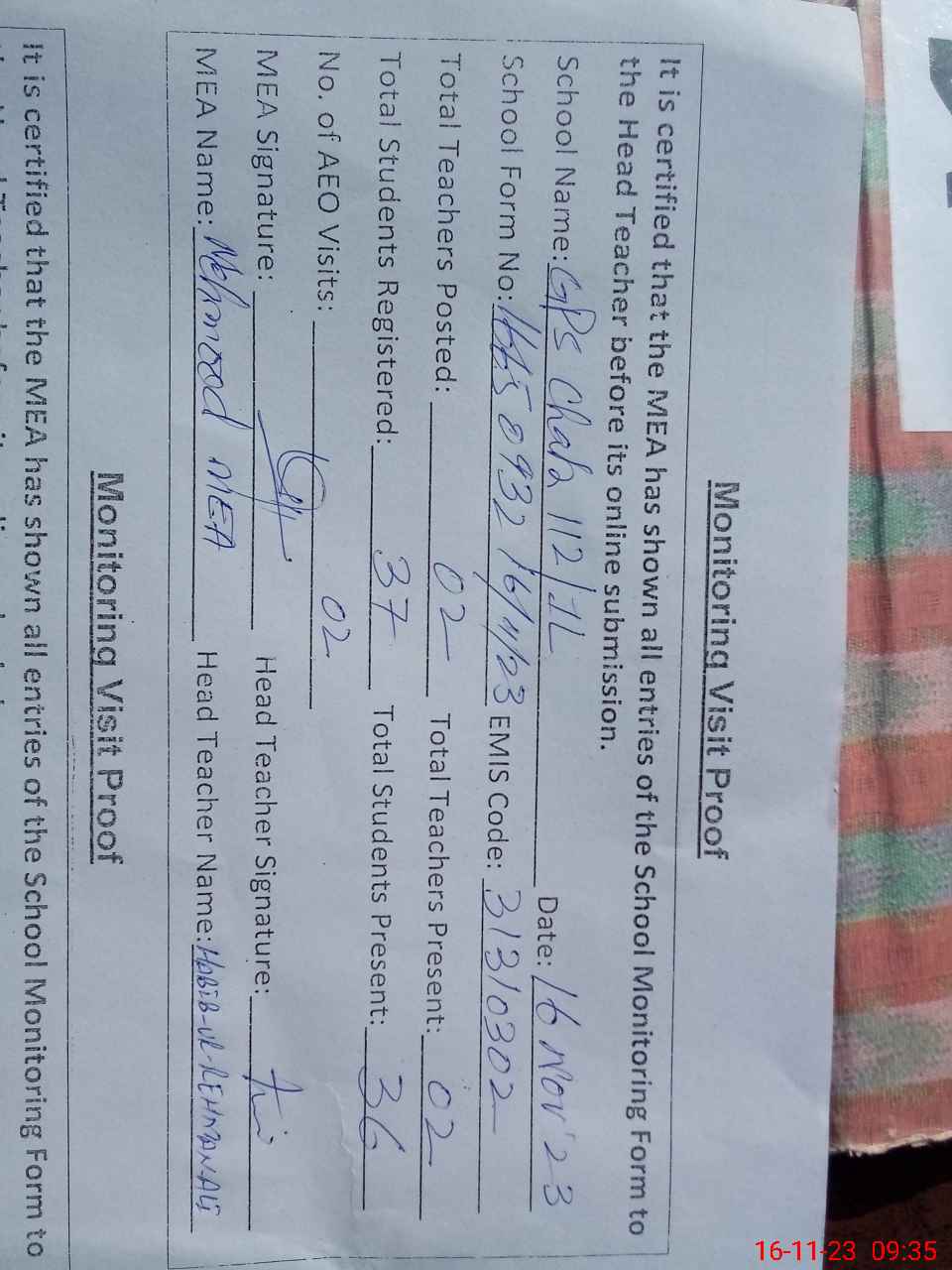 | Monitoring Date: 16-11-2023 | Start Time: 16-11-2023 09:15 AM | End Time: 16-11-2023 09:37 AM | Name of MEA: Ma**** UlHa**** | |
