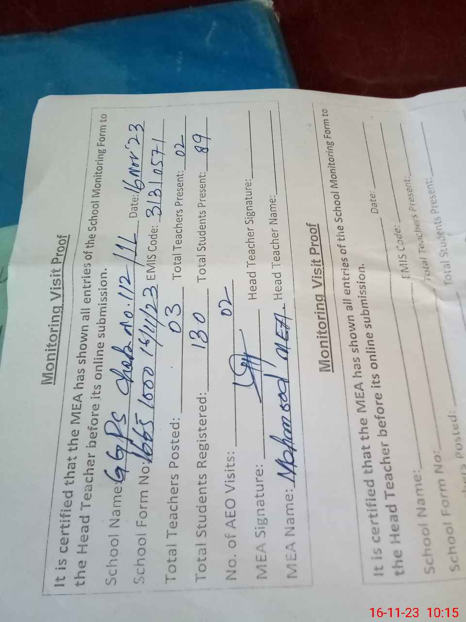 | Attendance Register | Head Teacher | MEA with School | Visit Proof |