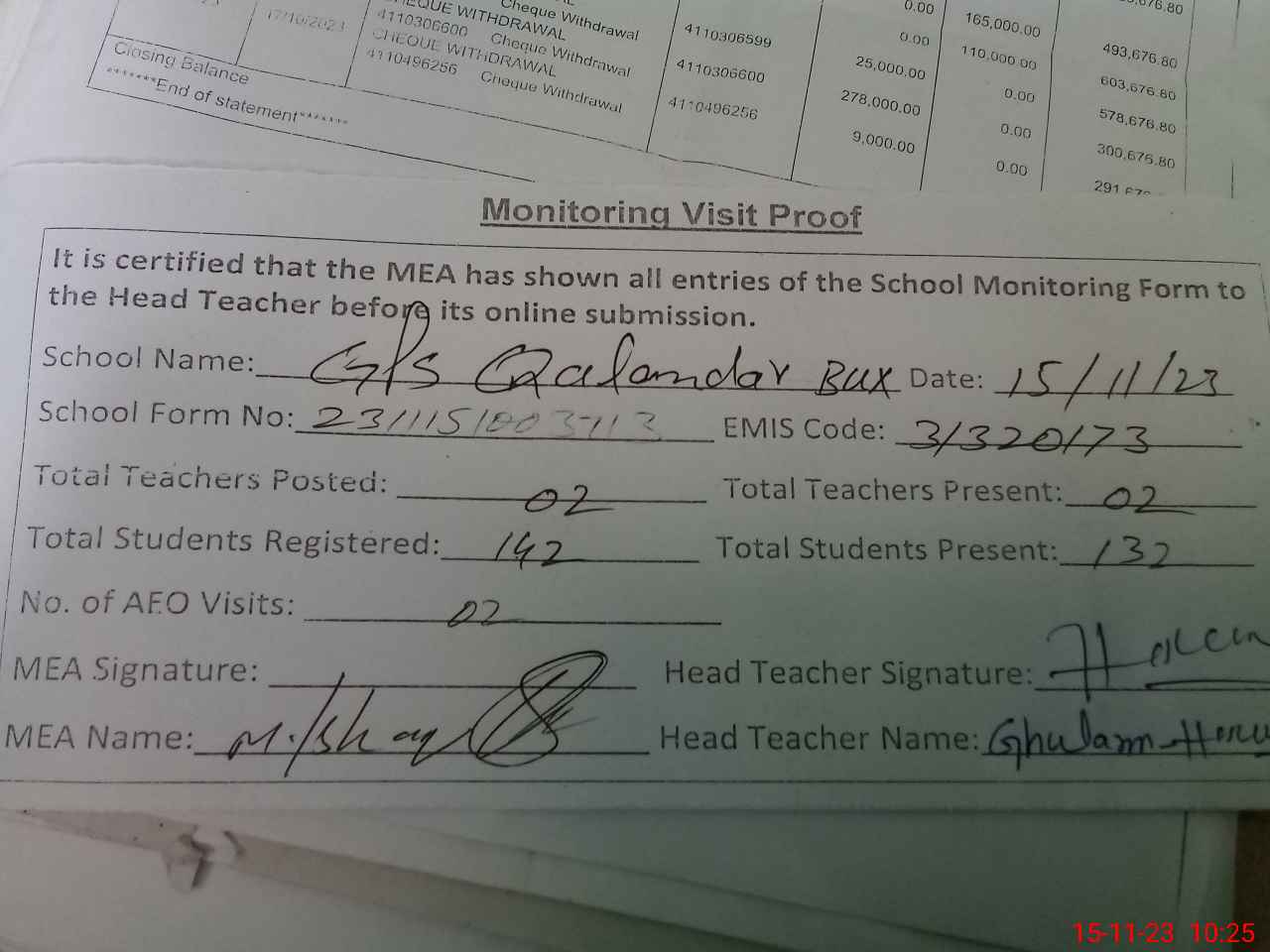 | Attendance Register | Head Teacher | MEA with School | Visit Proof |