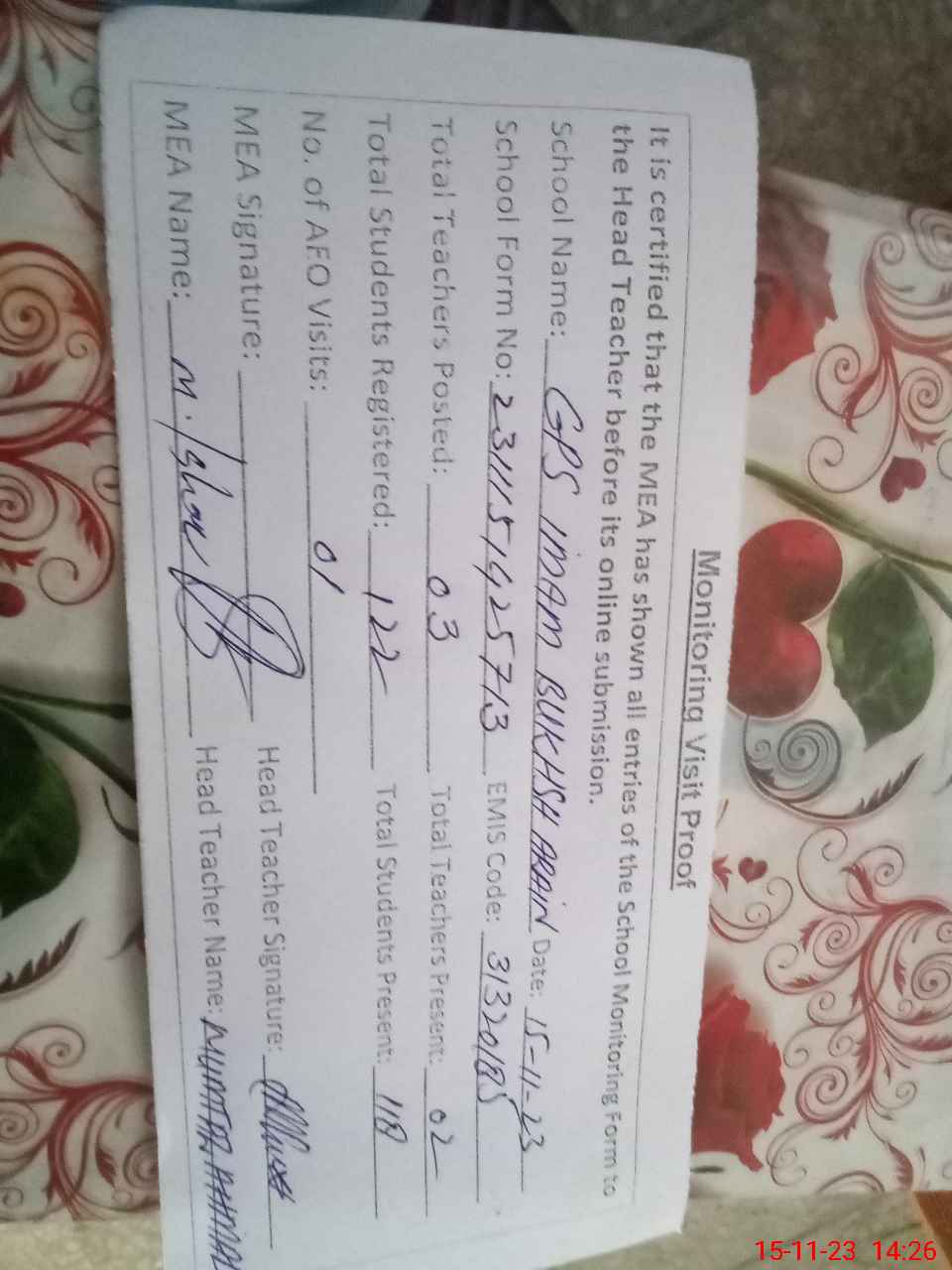 | Attendance Register | Head Teacher | MEA with School | Visit Proof |