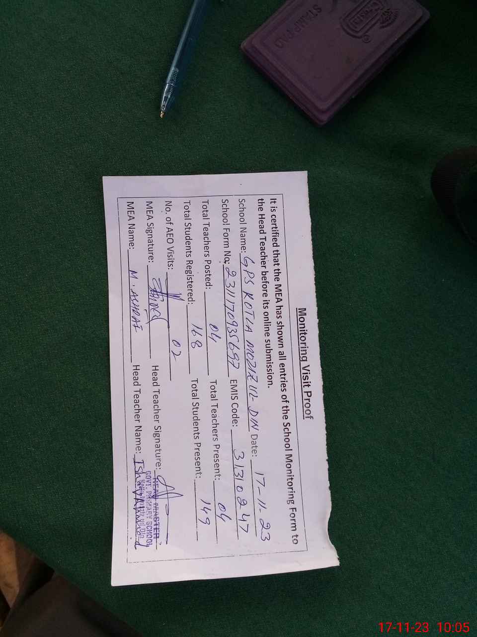 | Attendance Register | Head Teacher | MEA with School | Visit Proof |