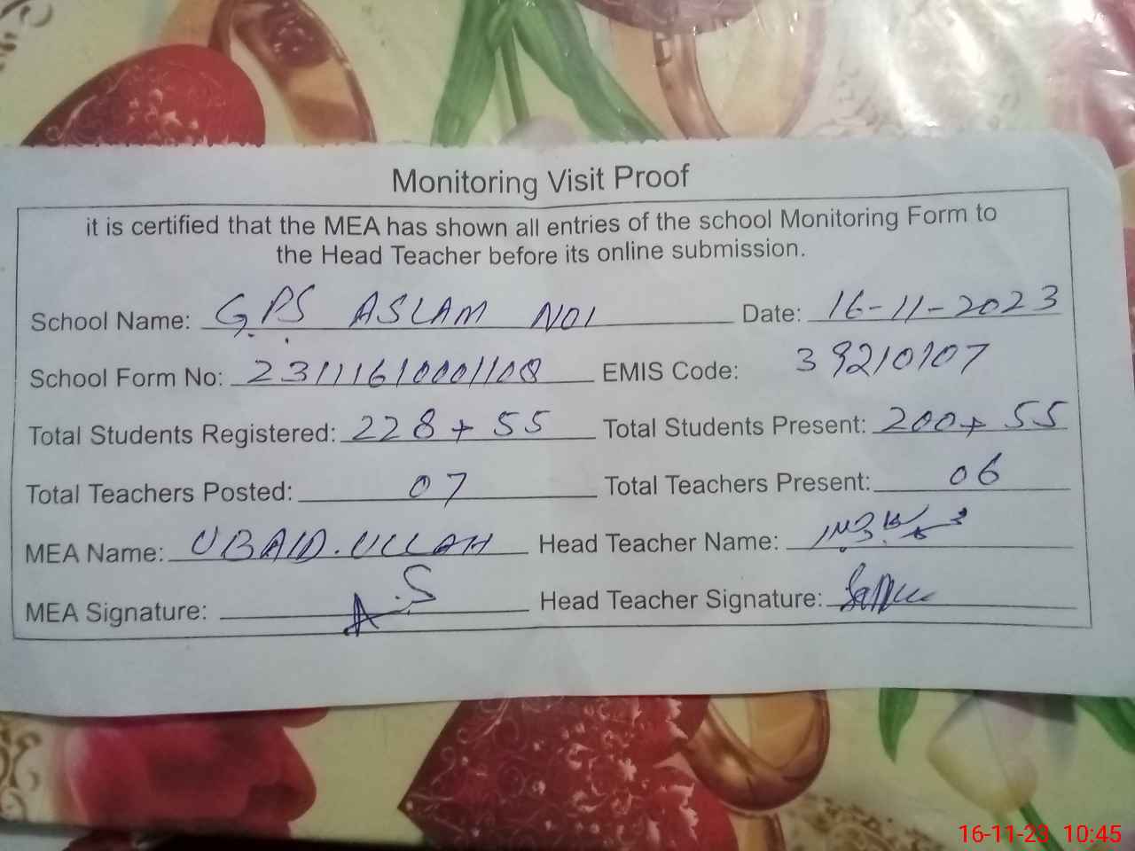 | Attendance Register | Head Teacher | MEA with School | Visit Proof |