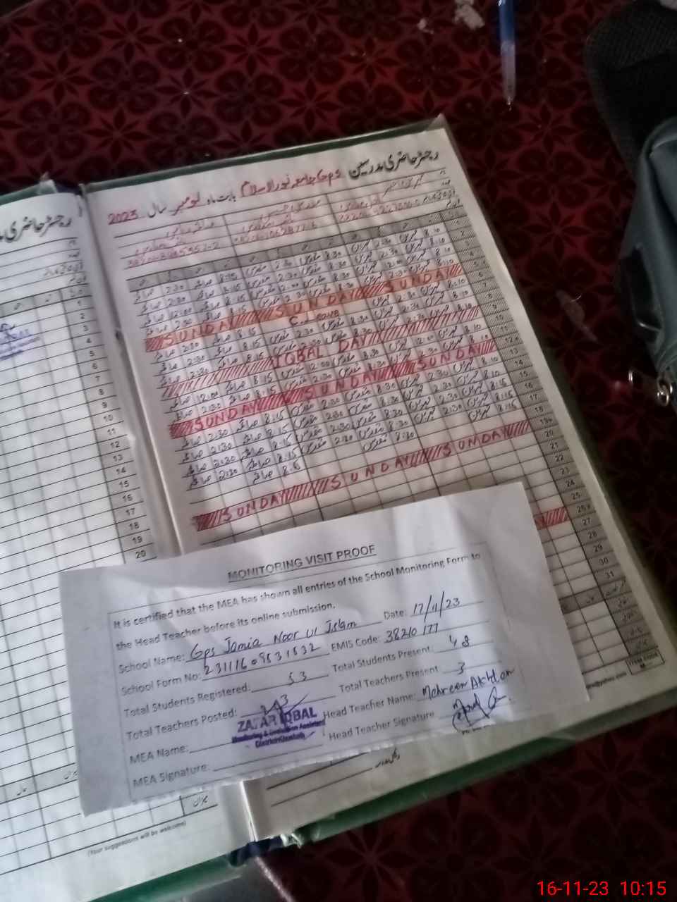 | Attendance Register | Head Teacher | MEA with School | Visit Proof |