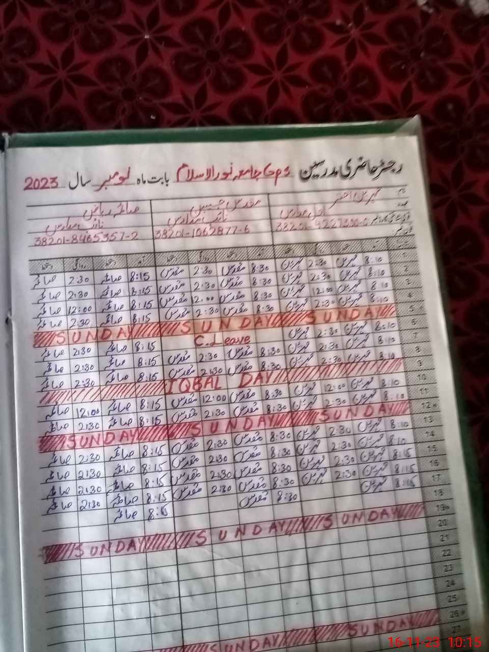 | CNIC | Full Name | Designation | R/C | Absence During Last Calender Month |