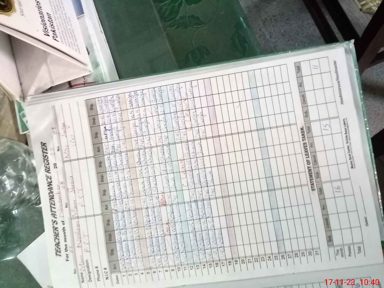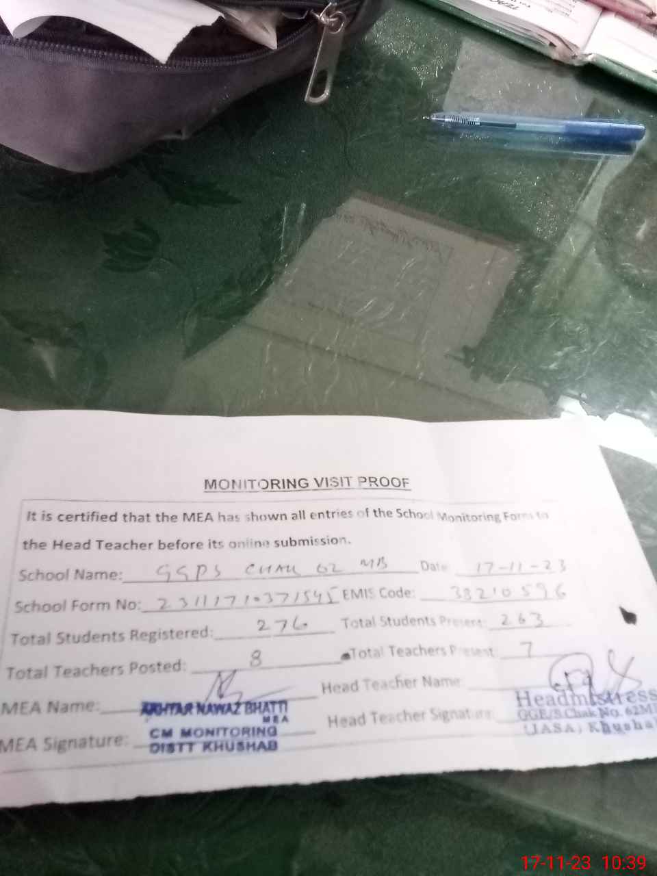 | Attendance Register | Head Teacher | MEA with School | Visit Proof |